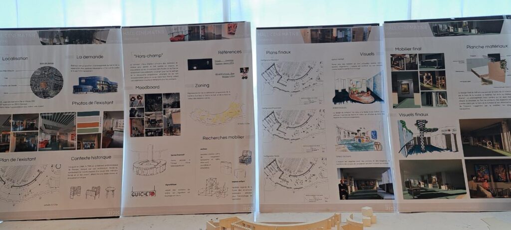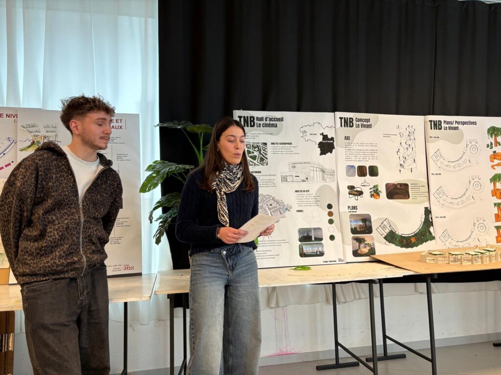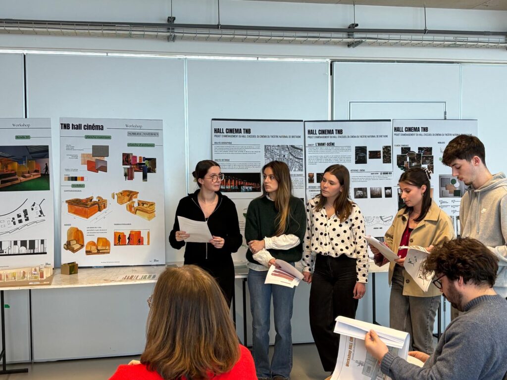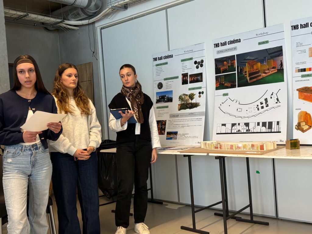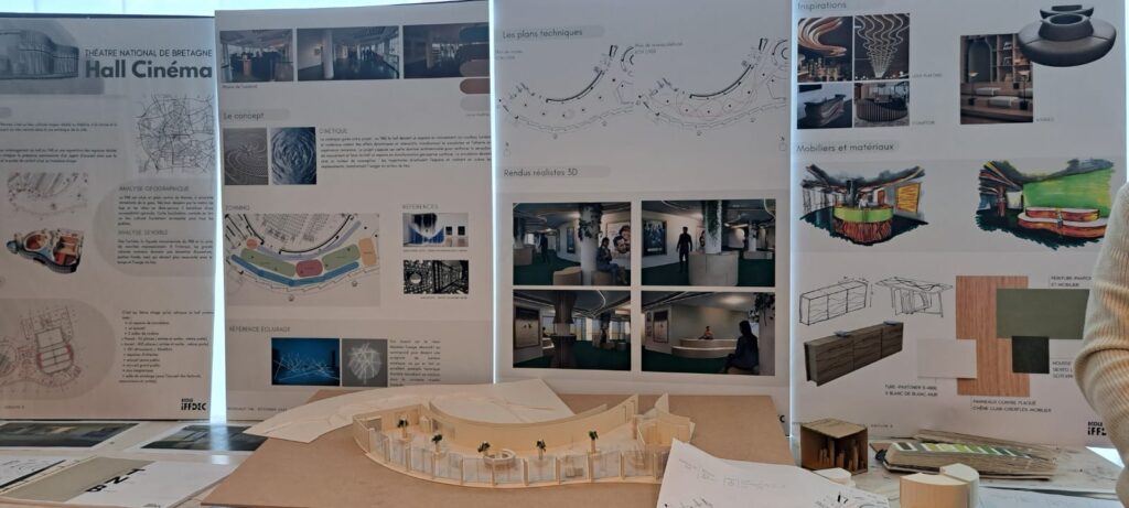 Le Théâtre National de Bretagne (TNB) a confié aux étudiants en 2ᵉ et 3ᵉ année d’architecture d’intérieur de l’Iffdec une mission concrète et professionnalisante : repenser l’aménagement du hall d’accueil de la partie cinéma. Sous la conduite des professeurs Catherine Allain, Jean Spiral et Julie Quaglia, les groupes ont eu 4 jours intensifs de conception, puis un oral en présence de la responsable de la programmation du TNB.