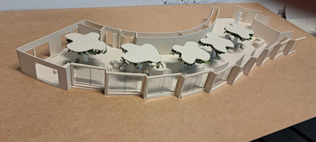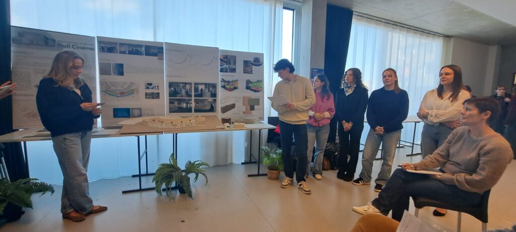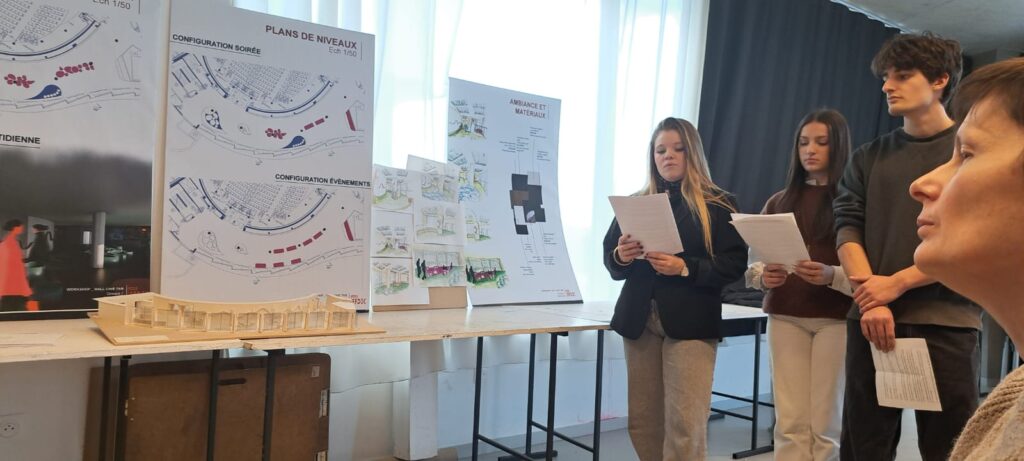 - Recherche & conception : formulation d’un concept unique par groupe, croquis perspectives, maquettes de principe ; réalisation des plans de l’existant au 1/50ᵉ ajustés après visite.