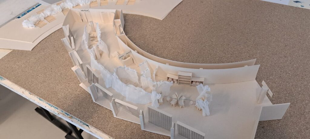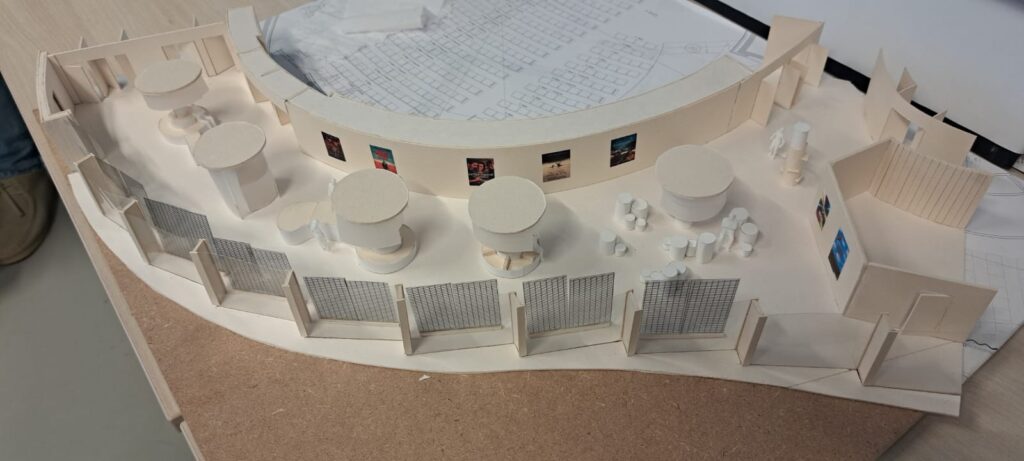 - Propositions de mobilier sur mesure présentées en plans et maquettes (banquette-rangement, comptoir billetterie, kiosque d’information mobile).