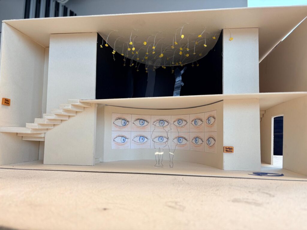 Les restitutions orales et maquettes ont révélé une grande variété de réponses : certaines équipes ont opté pour des cellules d’intimité serties dans le volume (micro-pièces sombres filtrant la lumière sud pour intensifier la perception tactile), d’autres pour des parcours fragmentés où des passerelles et niveaux successifs changent la posture du visiteur (debout, incliné, assis) transformant la visite en expérience performative.