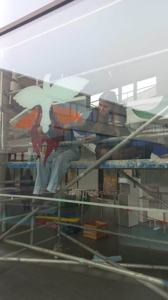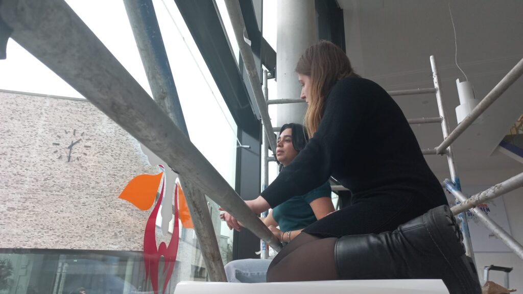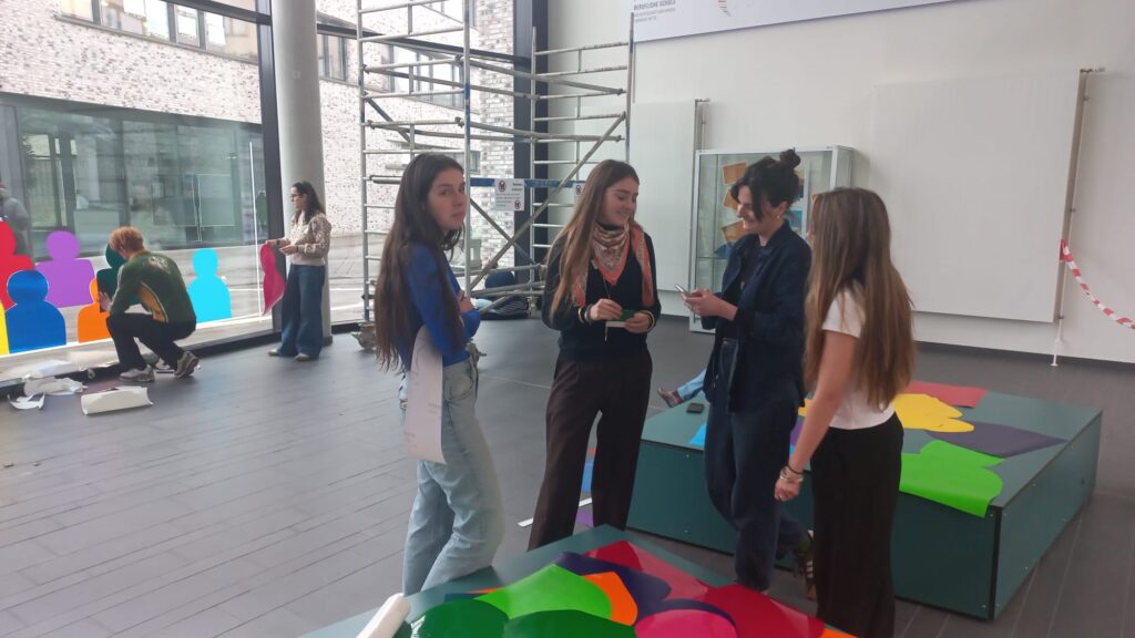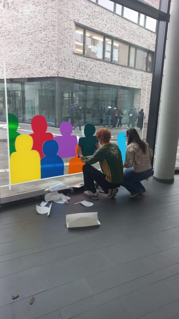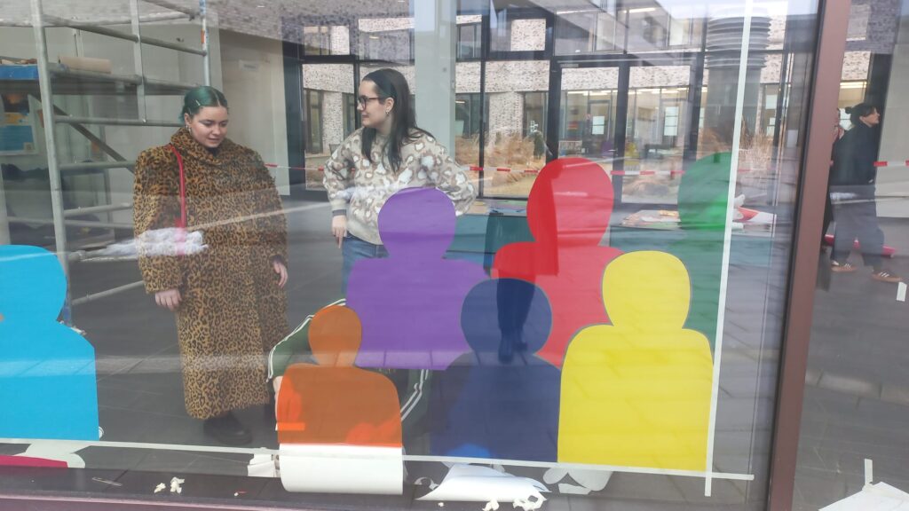Dans un second temps, chaque équipe choisit l’une des dimensions de la diversité (genre, handicap, origines culturelles, etc.) pour concevoir un vitrail contemporain destiné à une baie vitrée du foyer. La fenêtre mesure 3m25 sur 3m20 avec une bordure de 20 cm non décorée, et chaque installation doit comporter au moins deux sphères en plastique suspendues, visibles de l’intérieur et de l’extérieur. Le design est réalisé uniquement avec des films colorés découpés à la main, sans aucun texte, de sorte que seules les formes, couleurs et sphères symbolisent la thématique choisie. Les étudiants mettent en commun leurs idées, réalisent des croquis préparatoires et évaluent l’impact visuel de leur composition. L’exécution technique sur place exige rigueur et vigilance : nettoyage méticuleux de la surface vitrée, masquage des zones de travail, découpe sur tapis et usage de règles pour poser les films en toute sécurité. Cette phase pratique, supervisée par les enseignants, permet aux étudiants d’appliquer les méthodes de mise en scène spatiale et de vitrail apprises, tout en développant leur sens du détail et leur autonomie.