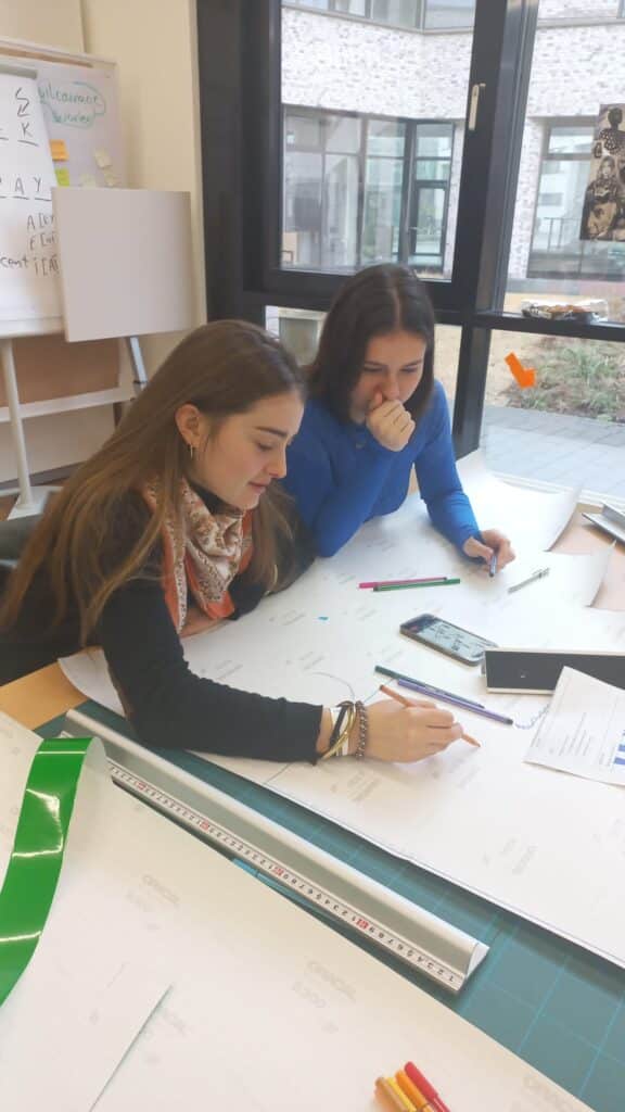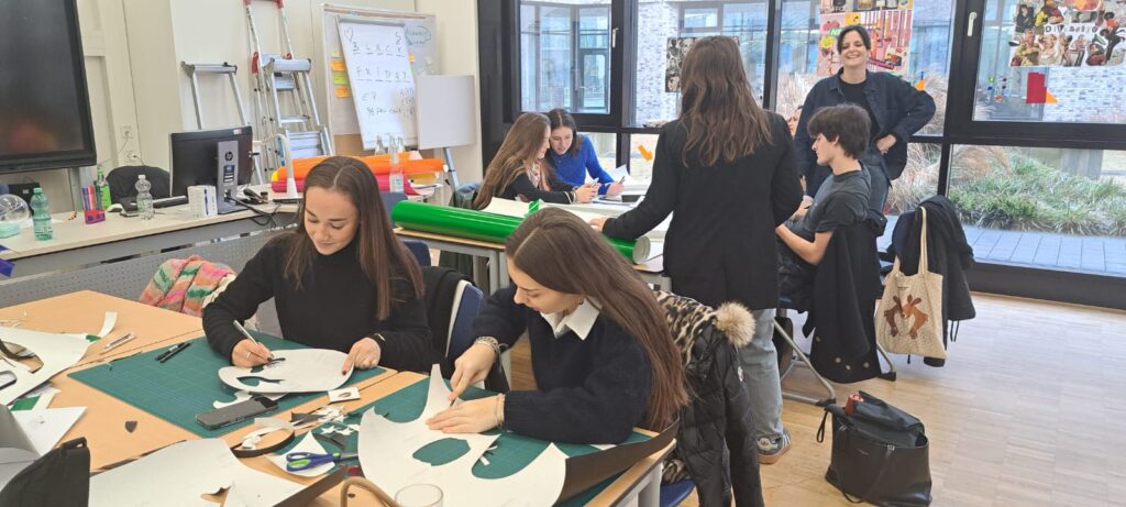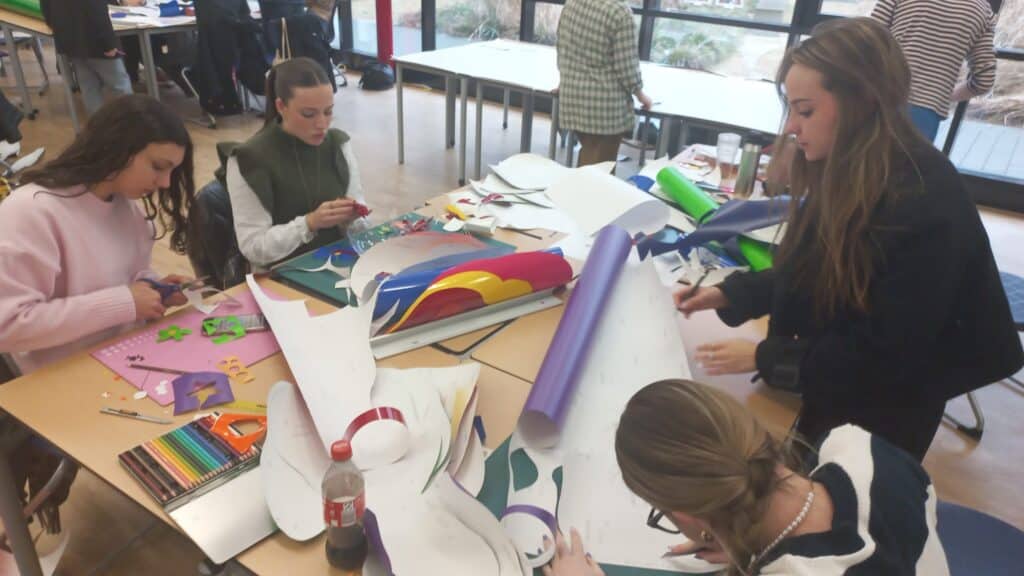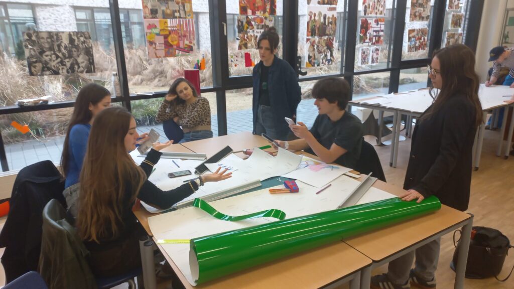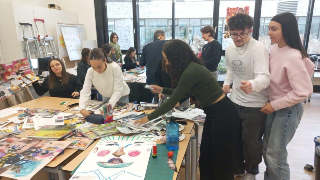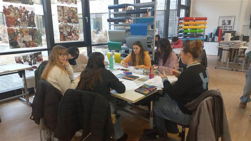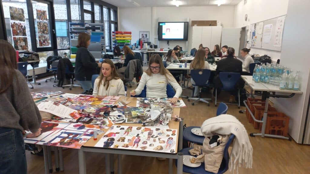 De 8h à13h, les matinées sont rythmées par le travail en atelier. D’entrée de jeu, la notion de diversité est placée au cœur des activités. En groupes mixtes franco-allemands, les étudiants créent d’abord des collages thématiques : ils découpent des magazines, choisissent des images et couleurs pour exprimer ce que le terme « diversité » signifie pour eux.