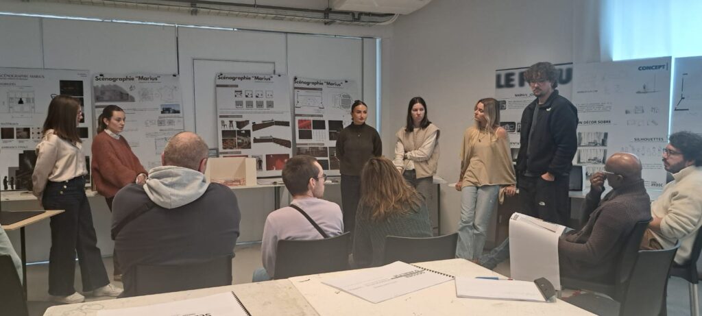 Le défi posé aux étudiants de 3ᵉ année en architecture intérieure de l’Iffdec ne se limitait pas à « habiller » une scène : il s’agissait de traduire en volumes, matières et lumière la puissance d’une adaptation contemporaine de Marius (adaptation de Joël Pommerat). Encadrés par les professeurs Catherine Allain et Jean-Baptiste Culot, par groupe de sept à huit étudiants ils ont travaillé en atelier de conception pour imaginer une scénographie fidèle à l’esprit du texte : nostalgie, tensions familiales, désir d’évasion, tout en répondant aux contraintes techniques et à la vie d’un plateau professionnel.