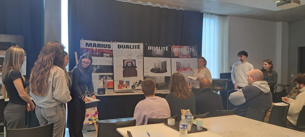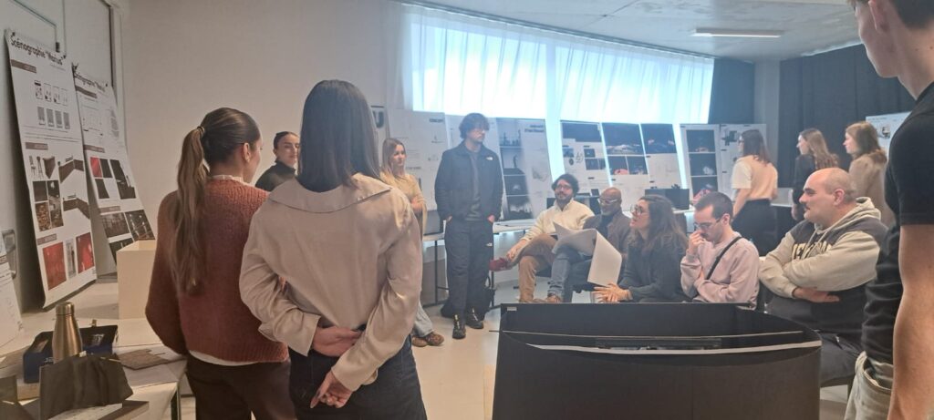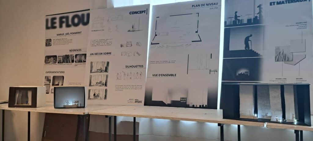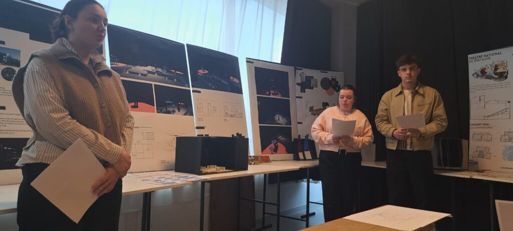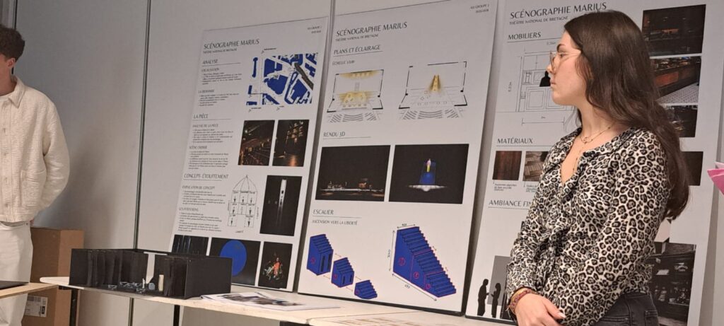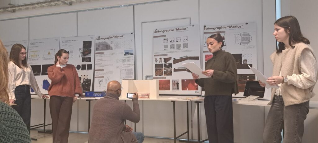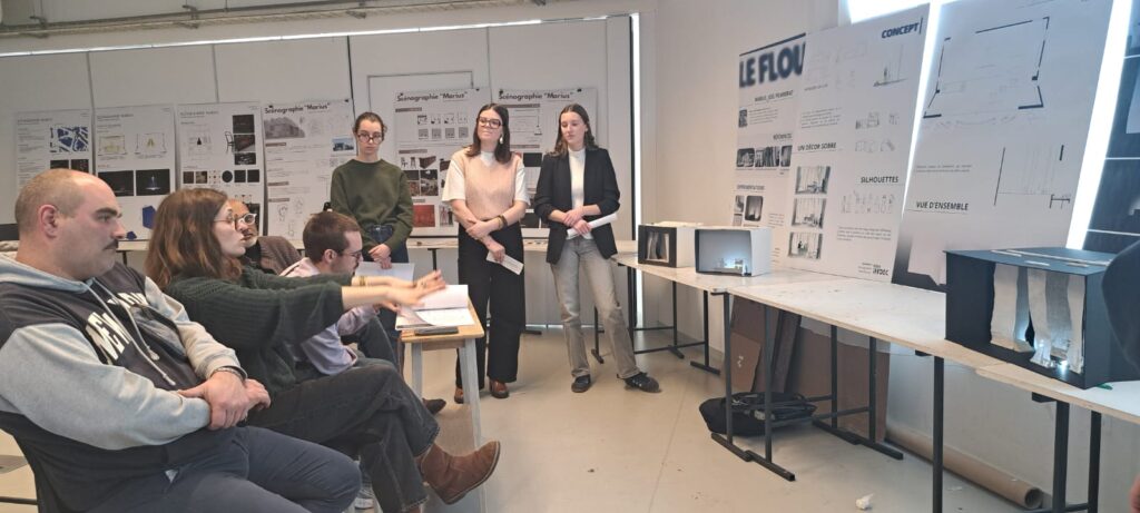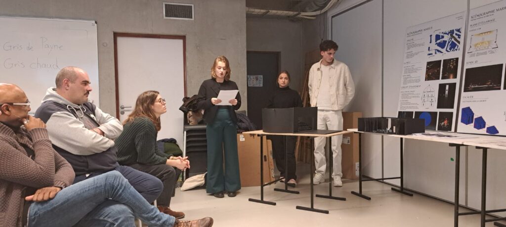 Les livrables exigés reflètent cette exigence : dossier d’analyse et cahier de recherches, storyboard intégral de la pièce (séquence par séquence), croquis et recherches volumétriques, maquettes de principe puis maquette finale, plans et coupes (plans de la scène fournis mais retravaillés et détaillés), choix des matériaux et de l’éclairage, planches A0 (analyse, concept, références, plans, perspectives, planche d’ambiance, matériaux). L’oral final, tenu en présence du metteur en scène et de son équipe, a offert aux étudiants l’occasion de confronter leurs propositions au regard de professionnels et d’expliquer les partis pris pour l’instant scénique qu’ils avaient choisi de représenter.