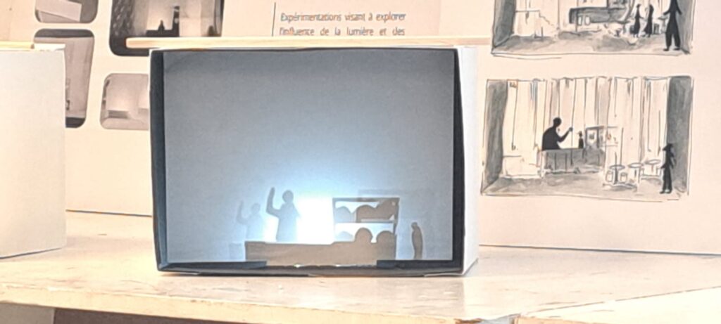 Une contrainte pédagogique forte : chaque groupe devait justifier un instant de la pièce par une scénographie précisément documentée, tout en ayant produit un storyboard couvrant l’intégralité du spectacle. Ce double enjeu, le détail du moment et la cohérence de l’ensemble, pousse à penser la scénographie comme narration visuelle continue, et non comme un simple décor.