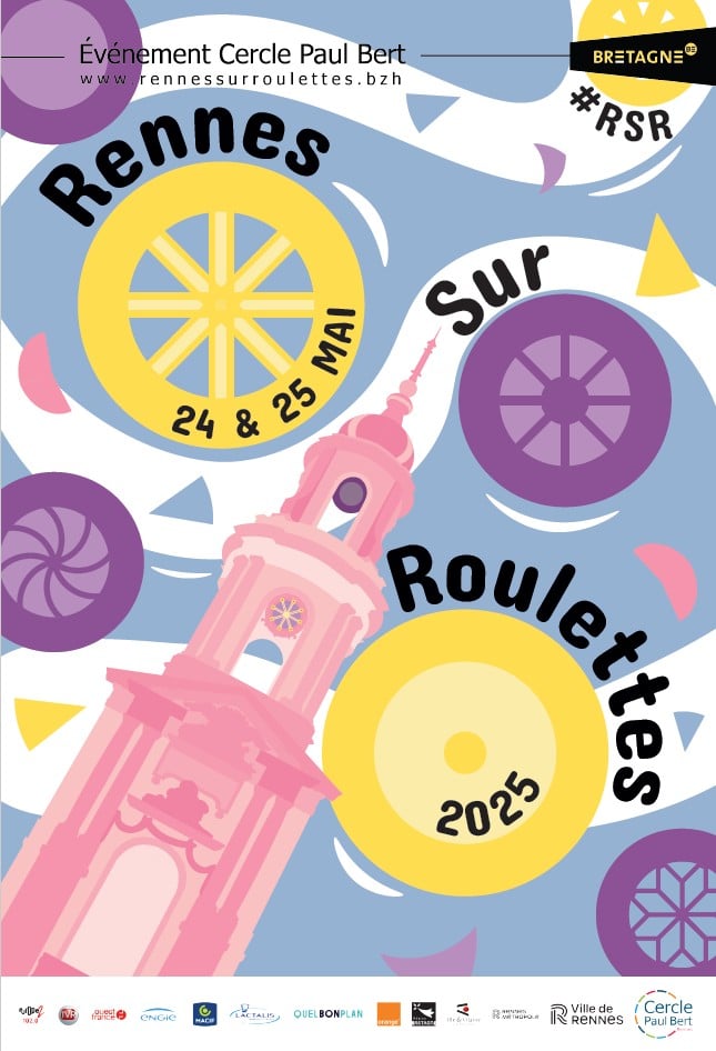 Diversité et Rassemblement : inspirée par l’aspect intergénérationnel et familial de l’événement, elle a utilisé des couleurs chaleureuses et des formes géométriques variées pour symboliser l’inclusivité et la convivialité de Rennes sur Roulettes.