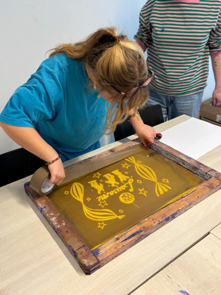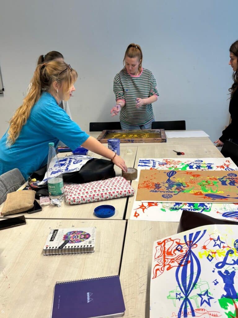 Ce protocole a généré des micro variations fascinantes : cinq tirages sortis d’une même matrice mais chacun doté d’un rythme, d’un souffle et d’une texture propres. Papiers grainés, passages opaques ou transparents, surimpressions partielles grâce à l’atelier a encouragé les étudiants à explorer la palette expressive de la sérigraphie : superpositions chromatiques, doubles expositions, textures imparfaites et accidents maîtrisés. Du point de vue graphique, la contrainte s’est révélée être une ressource : elle force à penser la composition en couches, à considérer l’espace négatif comme acteur, et à faire dialoguer texte et image par fragments.