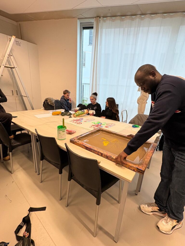 Ce protocole a généré des micro variations fascinantes : cinq tirages sortis d’une même matrice mais chacun doté d’un rythme, d’un souffle et d’une texture propres. Papiers grainés, passages opaques ou transparents, surimpressions partielles grâce à l’atelier a encouragé les étudiants à explorer la palette expressive de la sérigraphie : superpositions chromatiques, doubles expositions, textures imparfaites et accidents maîtrisés. Du point de vue graphique, la contrainte s’est révélée être une ressource : elle force à penser la composition en couches, à considérer l’espace négatif comme acteur, et à faire dialoguer texte et image par fragments.