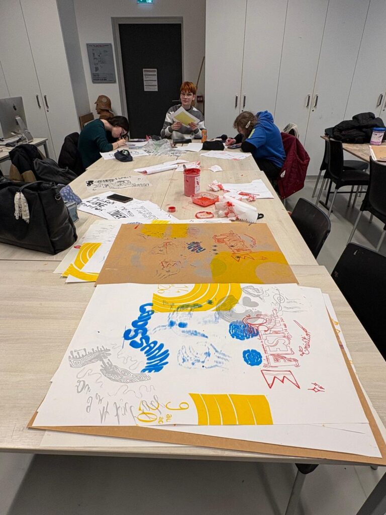 L’exercice imposait une règle simple et radicale qui a structuré toute la démarche : un seul cadre de sérigraphie disponible chaque jour, et avec ce cadre, chaque groupe ne pouvait imprimer qu’une partie de son visuel et de son texte. À la manière du cadavre exquis, les images et fragments textuels se complétaient au fur et à mesure des sessions. Chaque groupe disposait par ailleurs de cinq exemplaires de la même affiche, imprimés à chaque session avec la même matrice mais modulés par :