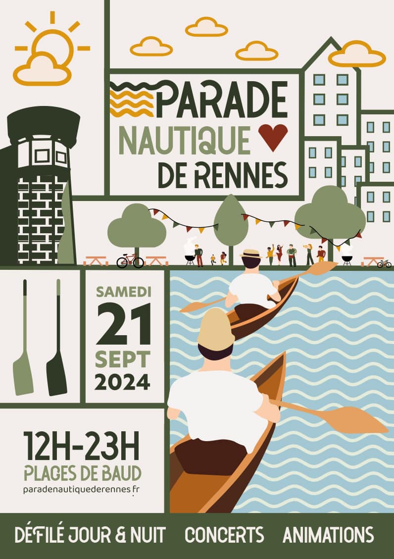 Après avoir présenté au comité de l’association ses réalisations, c’est le travail de Benjamin Landos, étudiant en Design Graphique, qui a finalement été sélectionné pour représenter l’association parmi les autres travaux d’élèves. Sa proposition a séduit le comité par l’incarnation du quartier, intégrant ses éléments architecturaux emblématiques, ainsi que par son professionnalisme et sa qualité d’écoute.En plus de créer la nouvelle identité graphique de l’association, Benjamin a donc également réalisé l’affiche de la Parade Nautique, événement phare de Rennes, dans le cadre d’un projet pédagogique supervisé par les enseignants Rahaf Demashki et Lilian Porchon.Cette affiche, qui rappelle des éléments architecturaux du quartier, rend également hommage au tableau Périssoires de Gustave Caillebotte (1848-1894), exposé au Musée des beaux-arts de Rennes. On y retrouve des marqueurs culturels forts, ainsi que le côté festif de l’évènement.