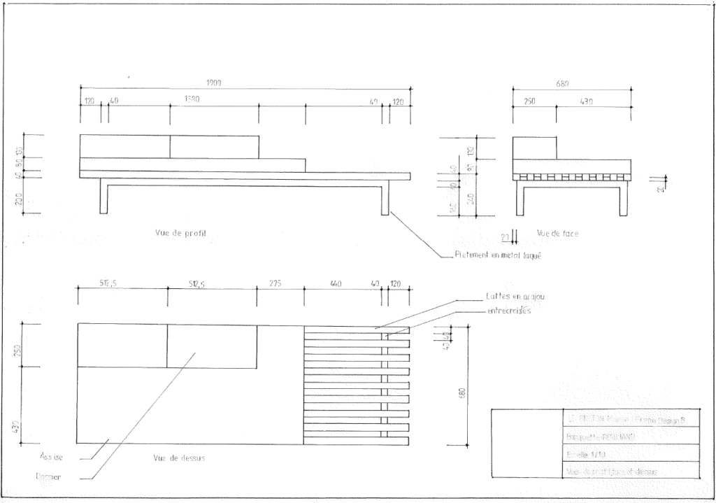 Dans le cadre du cours de dessin d’objet, les étudiants en Prépa Design devaient réaliser un projet portant sur la banquette conçue par l’architecte et designeuse française Charlotte Perriand en 1960. À partir du jeu de plans fournis, ils devaient produire, à l’échelle 1/10 et sur un format A3 horizontal, les différentes vues techniques de l’objet, à savoir une vue en plan, une vue de côté et une vue de face. Le travail devait intégrer une cotation précise ainsi que l’utilisation d’une terminologie adaptée, incluant notamment les éléments tels que les lattes en acajou, le piétement en métal laqué, les entretoises, l’assise et le dossier. Une attention particulière devait être portée au respect des épaisseurs de traits ainsi qu’à la cohérence des correspondances entre les différentes vues, conformément aux règles de projection en dessin technique.
